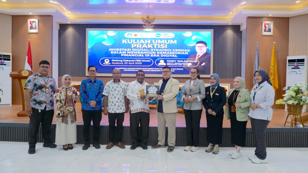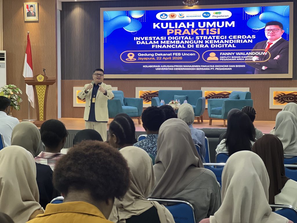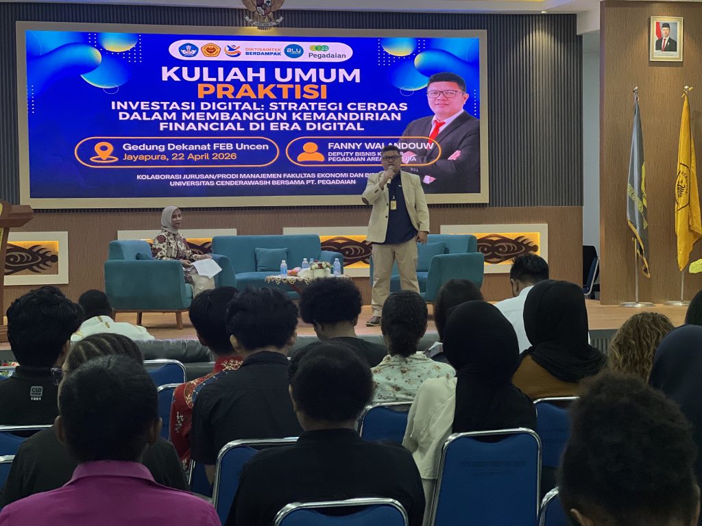 Program Studi Manajemen Fakultas Ekonomi dan Bisnis Universitas Cenderawasih sukses menyelenggarakan kegiatan Kuliah Umum Praktisi dengan tema “Investasi Digital: Strategi Cerdas dalam Membangun Kemandirian Financial di Era Digital” pada hari Rabu, 22 April 2026, pukul 09.00 WIT. Kegiatan ini menghadirkan narasumber utama, Bapak Fanny Walandouw, selaku Deputy Bisnis Kantor Pegadaian Area Jayapura.