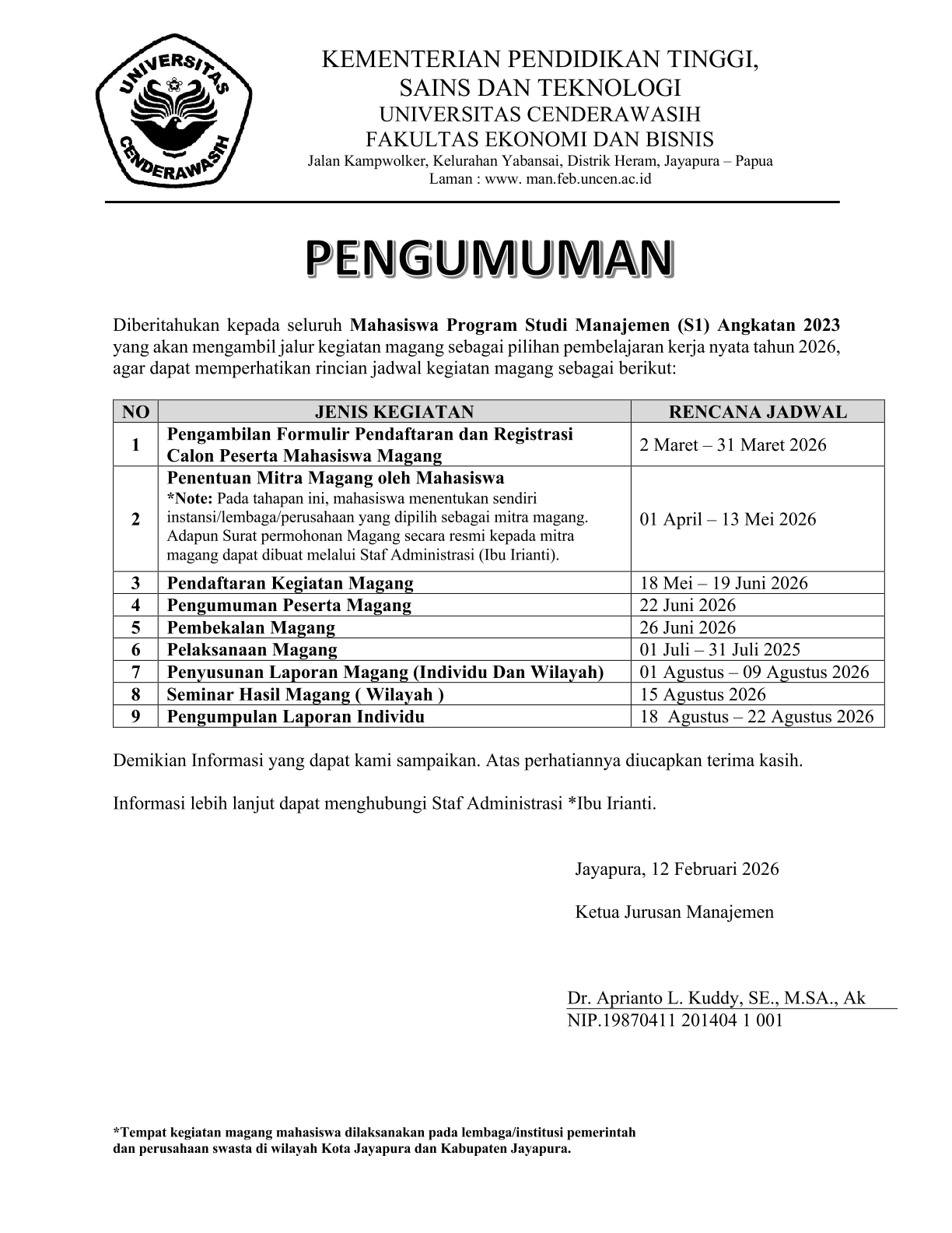 Diberitahukan kepada seluruh Mahasiswa Program Studi Manajemen (S1) Angkatan 2023 yang akan mengambil jalur kegiatan magang sebagai pilihan pembelajaran kerja nyata tahun 2026, agar dapat memperhatikan rincian jadwal kegiatan magang sebagai berikut: